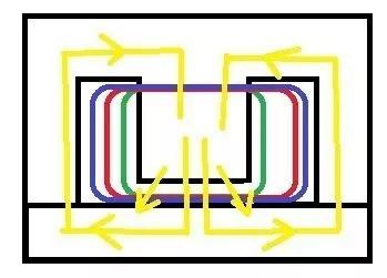Wie wir alle wissen, muss der Flyback-Topologie-Transformator einen Luftspalt in der mittleren Spalte öffnen, wie in der Abbildung oben gezeigt. Nachdem der Luftspalt des Magnetkerns geöffnet wurde, ist es offensichtlich, dass der Kantenstreufluss zunimmt, vorausgesetzt, der Magnetfluss wird gelb dargestellt. Jeder, der sich mit EMV beschäftigt hat, sollte die Kraft des magnetischen Streuflusses kennen, daher besteht hier kein Grund, darüber zu sprechen.